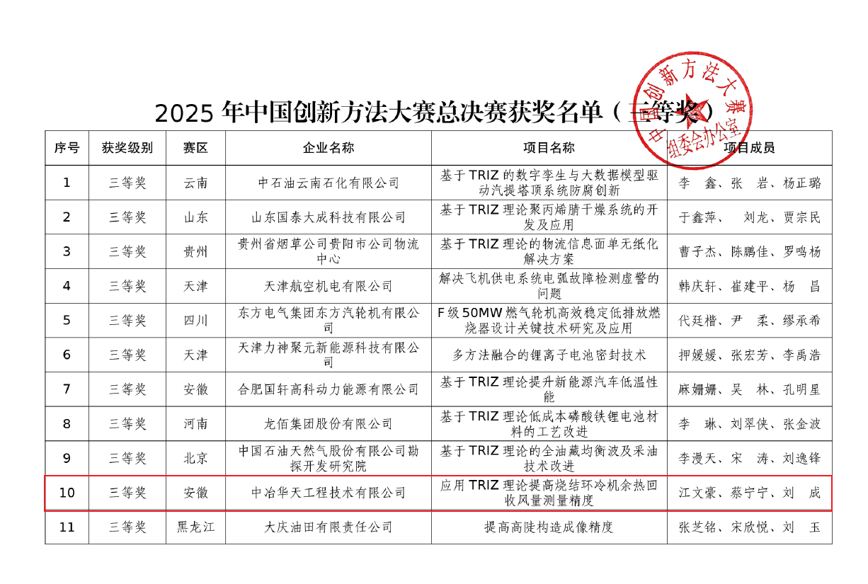 11月17日至21日,2025年中國(guó)創(chuàng)新方法大賽全國(guó)總決賽在山東泰安和濟(jì)南舉辦,中冶華天參賽作品《應(yīng)用TRIZ理論提高燒結(jié)環(huán)冷機(jī)余熱回收風(fēng)量測(cè)量精度》斬獲三等獎(jiǎng),充分展現(xiàn)了華天積淀深厚的創(chuàng)新底蘊(yùn)和華天員工昂揚(yáng)奮進(jìn)的創(chuàng)新風(fēng)采。