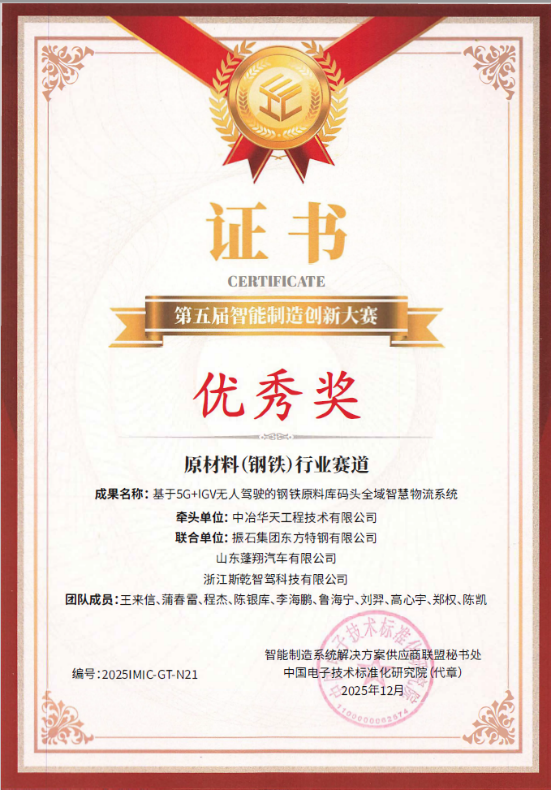 近日,第五屆智能制造創(chuàng)新大賽結(jié)果揭曉。中冶華天牽頭申報的兩項成果——“AI+熱軋長材車間智能制造關(guān)鍵技術(shù)與應(yīng)用”和“基于5G+IGV無人駕駛的鋼鐵原料庫碼頭全域智慧物流系統(tǒng)”,分別入選“AI+制造”解決方案賽道與原材料(鋼鐵)行業(yè)賽道決賽并獲優(yōu)秀獎。上述成果有力展現(xiàn)了公司在鋼鐵智能制造與智慧物流領(lǐng)域的技術(shù)積累、系統(tǒng)集成能力與工程化落地水平。
